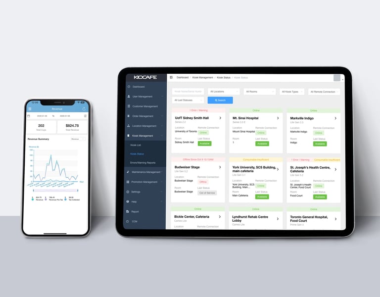 KioCafé Analytics serves as a core management tool for tracking customer accounts, sales, demographics, and system performance, helping operators efficiently manage multiple locations simultaneously.
